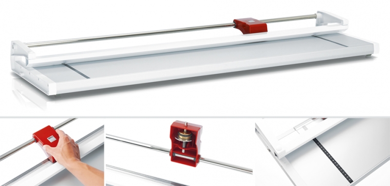Nadaje się do cięcia i przycinania rysunków technicznych, papieru i folii, szkiców, planów, zdjęć, plakatów i tym podobnych wydruków cyfrowych. Szczelinowe wsporniki boczne do cięcia w wybranej wielkości formatu. Gładkie i bezpieczne prowadzenie głowicy tnącej, samoostrzenie noża krążkowego wykonanego ze specjalnej hartowanej stali. Przeciw ostrze wykonane z nierdzewnej stali. Automatyczny system dociskowy z przezroczystego tworzywa powoduje, że cięty materiał nie przesuwa się w trakcie pracy. Wysokiej jakości płyta podstawy tnącej wykonana z anodowanego aluminium. Dwie skale pomiarowe wyskalowane w [cm]. Solidne wsporniki boczne wykonane z tworzywa sztucznego ABS odpornego na uderzenia. Precyzyjna poprzeczka ułatwiająca ruch głowicy tnącej. Cztery antypoślizgowe gumowe nóżki. Kolor: aluminiowy szary / biały.